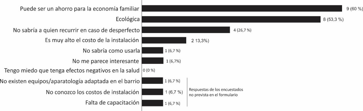 En relación a la pregunta “¿Qué opina de la energía solar?”, con la posibilidad de elegir más de una opción y añadir otras, el mayor número de respuestas se enfocan en la cuestión económica, con un 60% que considera que “puede ser un ahorro para la economía familiar”, seguido de un 53,3% que la considera “ecológica”. En cuanto a las respuestas que demuestran dudas se registra: “no sabría a quién recurrir en caso de un desperfecto” (26,7%), “es muy alto el consto de la instalación” (23%), “no sabría cómo usarla” (6,7%) y “no me parece interesante” (6,7%). Ningún encuestado señalo la opción “Tengo miedo que tenga efectos negativos en la salud”. Luego se registran respuestas no previstas entre las opciones con una respuesta cada una “no existen equipos y aparatología adaptada en el barrio”, “no conozco los costos de instalación” y “falta de capacitación”, como se observa en la Figura 5.