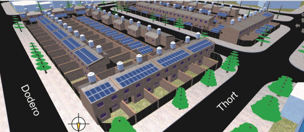 Para ello se realizó un modelo en tres dimensiones del barrio en el programa Sketch Up (producto de Google de uso libre y gratuito) teniendo en cuenta un entorno aproximado de 100 metros e incorporando la vegetación de gran porte existente. El modelo fue exportado al programa PV*SOL premium 2019.