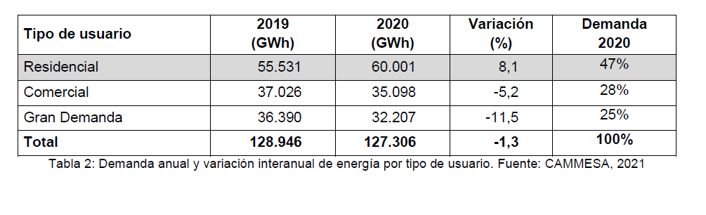 En el año 2020, como resultado del aislamiento social preventivo y obligatorio (ASPO) la demanda de energía de la Argentina registró una disminución interanual del 1,3%. Sin embargo, la demanda residencial se incrementó en un 8,1% (CAMMESA, 2021) como puede observarse en la Tabla 2.