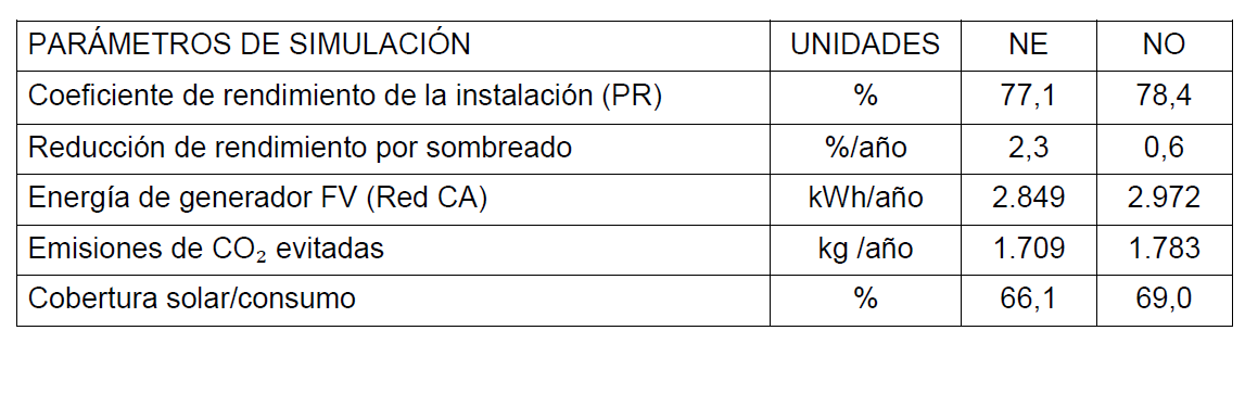 En la Tabla 3 se transcriben los principales resultados de la simulación donde se observa una cobertura de la generación solar en relación al consumo teórico del 66,1% para la orientación Noreste y el 69% para la orientación Noroeste del arreglo.