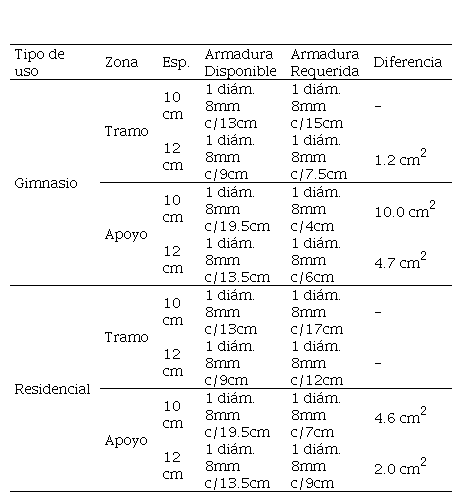 En la Tabla 8, se presenta una síntesis ordenada de los requerimientos de armadura y la disponibilidad de las mismas según cada losa y según el tipo de uso que tenga el edificio.