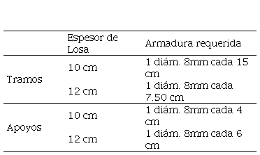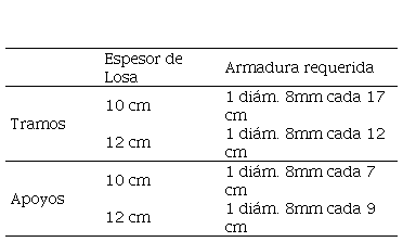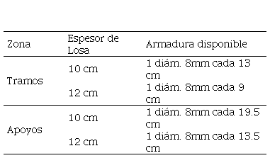 Las losas a verificar se encuentran armadas en una sola dirección con una luz de 3.85m. Las armaduras disponibles se presentan en la Tabla 2.