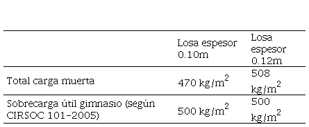 Uno de los potenciales usos del edificio en estudio es el de un gimnasio, en donde se desarrollarán actividades que pueden inducir sobre la estructura cargas dinámicas. A los fines de poder determinar los parámetros necesarios para efectuar las verificaciones necesarias se procede a realizar el análisis de carga correspondiente, cuya síntesis se presenta en la Tabla 3. En relación a la ubicación de las losas se realizará la verificación sobre PB y sobre 1º Piso, teniendo en cuenta que son las losas solicitadas por carga dinámica. El Reglamento CIRSOC 101-2005 establece que “…las tribunas, estadios o estructuras similares suelen estar sujetas a cargas de impacto causadas por muchedumbres moviéndose al unísono …. Para tener en cuenta este efecto… se puede adoptar un coeficiente de impacto de 1.5, por el que se deberán multiplicar las cargas para realizar el cálculo de los elementos estructurales cercanos a la ubicación de la carga…”