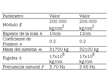 Siendo f la frecuencia natural del sistema, k la rigidez flexional, m la masa, E el módulo de deformación del hormigón, h el espesor de la losa y v el coeficiente de Poisson del hormigón.