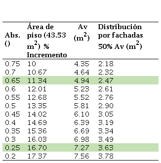 Fuente: Elaboración propiaa) Cálculo Proporcional de Áreas Vidriadas. Considerando la relación inversa entre la absortancia solar de las superficies exteriores y el área vidriada admisible, se realizó un cálculo de proporcionalidad inversa de las variables, en un rango de absortancias entre 0.75 y 0.2 (en orden decreciente, con intervalos de 0.05), para la determinación del área vidriada óptima, según el caso. Dichos valores máximo y mínimo provienen de los cálculos de ā verificados en las propuestas realizadas para los locales monitoreados.