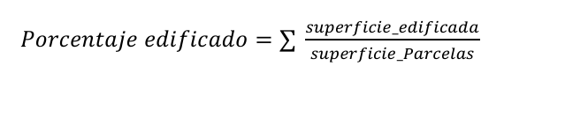 El porcentaje edificado se obtiene mediante la sumatoria de la superficie edificada dividida la superficie de las parcelas.