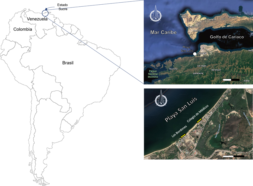 La ciudad de Cumaná se ubica en la región nororiental de Venezuela (Figura 1) y se caracteriza por sus actividades pesqueras y portuarias alrededor de la desembocadura principal del río Manzanares, donde también existen actividades urbanas e industriales (Fuentes et al. 2008) que actúan como presiones de los ecosistemas costeros, contribuyendo a la acumulación de plásticos a lo largo de la costa. San Luis se localiza al extremo oeste de la ciudad, es la playa urbana más extensa del estado Sucre y posee fondo arenoso. A lo largo del litoral existen viviendas, hoteles/posadas, ventas informales de comida. Debido a sus características se cataloga como una zona residencial-recreacional/turística, puesto que se desarrollan diferentes actividades deportivas, de pesca artesanal y actividades turísticas-económicas formales e informales, que se concentran principalmente en algunas zonas del litoral. Para este estudio fueron considerados Colegio de Médicos y Los Bordones, los sectores más concurridos de esta playa.
