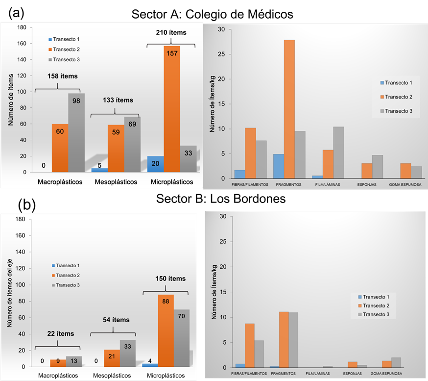 Distribución de macroplásticos mesoplásticos y microplásticos en función de los transectos y contenido de las formas de las partículas plásticas en número de ítemskg reportados en las muestras a Sector A Colegio de Ingenieros b Sector B Los Bordones