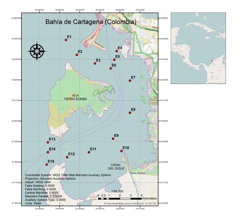 La bahía de Cartagena, localizada al noroeste de Suramérica, en el mar Caribe colombiano, está conformada por la bahía interna; ubicada al norte y la bahía principal o externa, conectada al mar Caribe por los estrechos de Bocachica al sur y Bocagrande, al norte (Franco-Arias et al., 2013). Geológicamente es considera como una bahía, sin embargo, la entrada de aguas fluviales provenientes del Canal del Dique le da el calificativo de estuario (CIOH- UNOPS, 1997). La bahía de Cartagena se encuentra influenciada por diversas acciones antrópicas, entre las cuales se pueden citar, las descargas de residuos industriales, vertimiento de residuos oleosos, introducción de especies invasoras transportadas en las aguas de lastre por las actividades portuarias, y vertimientos de aguas negras domésticas, cargadas de materia orgánica y nutrientes provenientes de la ciudad de Cartagena de Indias (CIOH-UNOPS, 1997).
