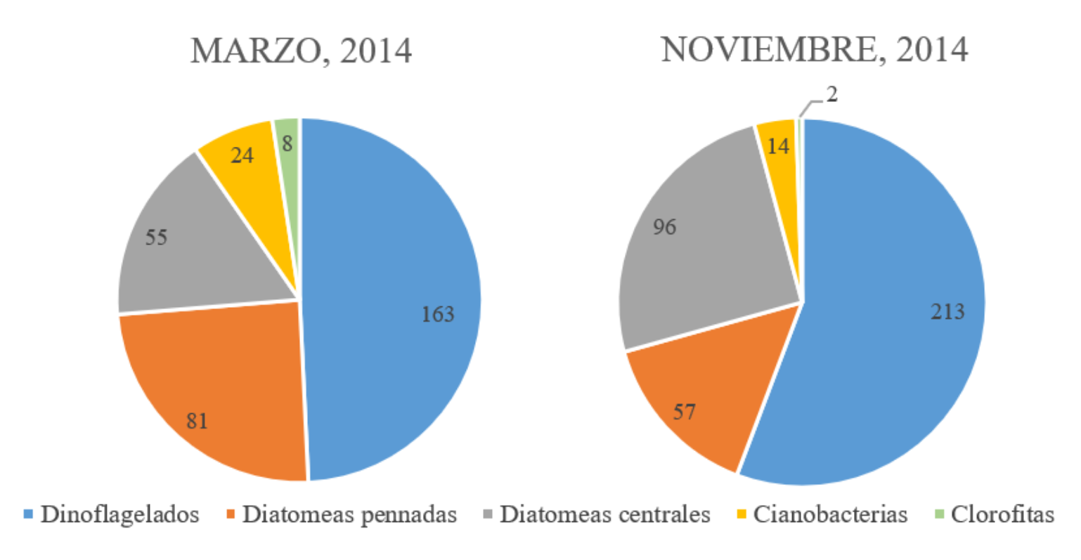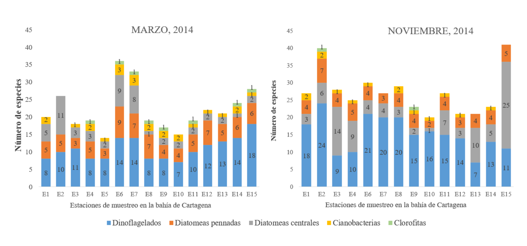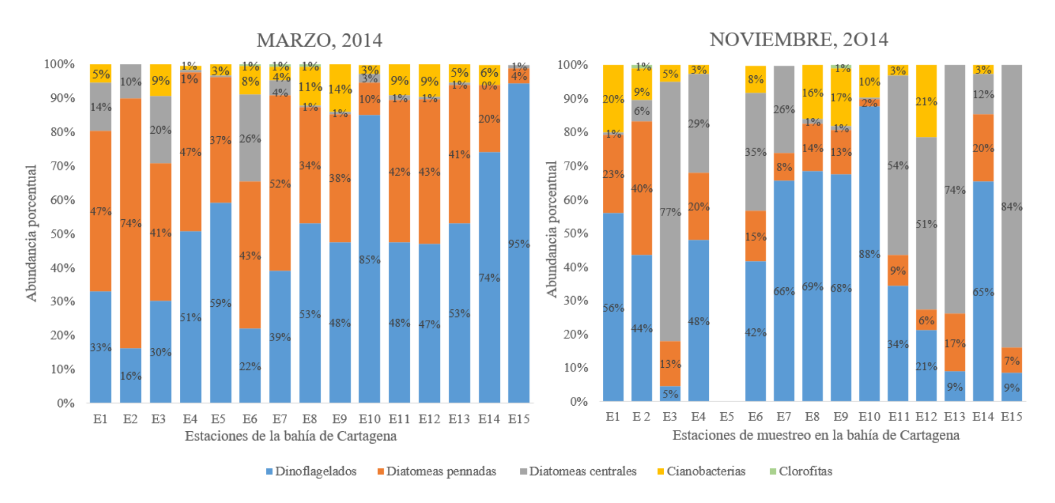El grupo de los dinoflagelados dominó la bahía de Cartagena durante el periodo seco (marzo) y gran parte de las estaciones en la época lluviosa durante el año 2014. Este resultado difiere de los obtenidos en estudios previamente realizados en esta área, donde también se identificó y cuantificó la comunidad de fitoplancton (Arosemena et al. 1973; Vidal y Carbonell, 1977; Arias y Durán, 1982; Tigreros, 2002; Cañón et al. 2005; Gavilán et al. 2005; Suárez, 2007; Osorio, 2010), y en los cuales se encontró que el grupo de las diatomeas centrales era el más predominante en la bahía de Cartagena.