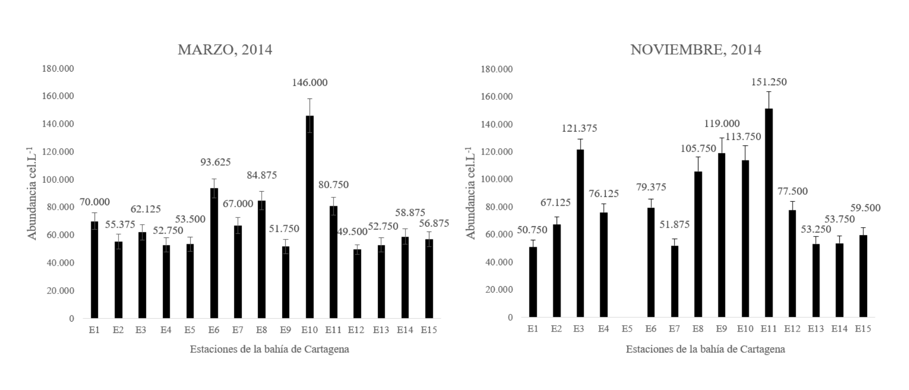 El promedio de las abundancias fue de 68.982 cel.L-1 en la época seca y 84.312 cel.L-1 en la época lluviosa. Las máximas abundancias (Figura 4) fueron de: 146.000 cel.L-1 y 151.250 cel.L-1, en los periodos seco y lluvioso respectivamente, y estuvieron ubicadas en la misma región (frente a la desembocadura del Canal del Dique). Así como las mínimas abundancias fueron de 125 cel.L-1 en ambos periodos.