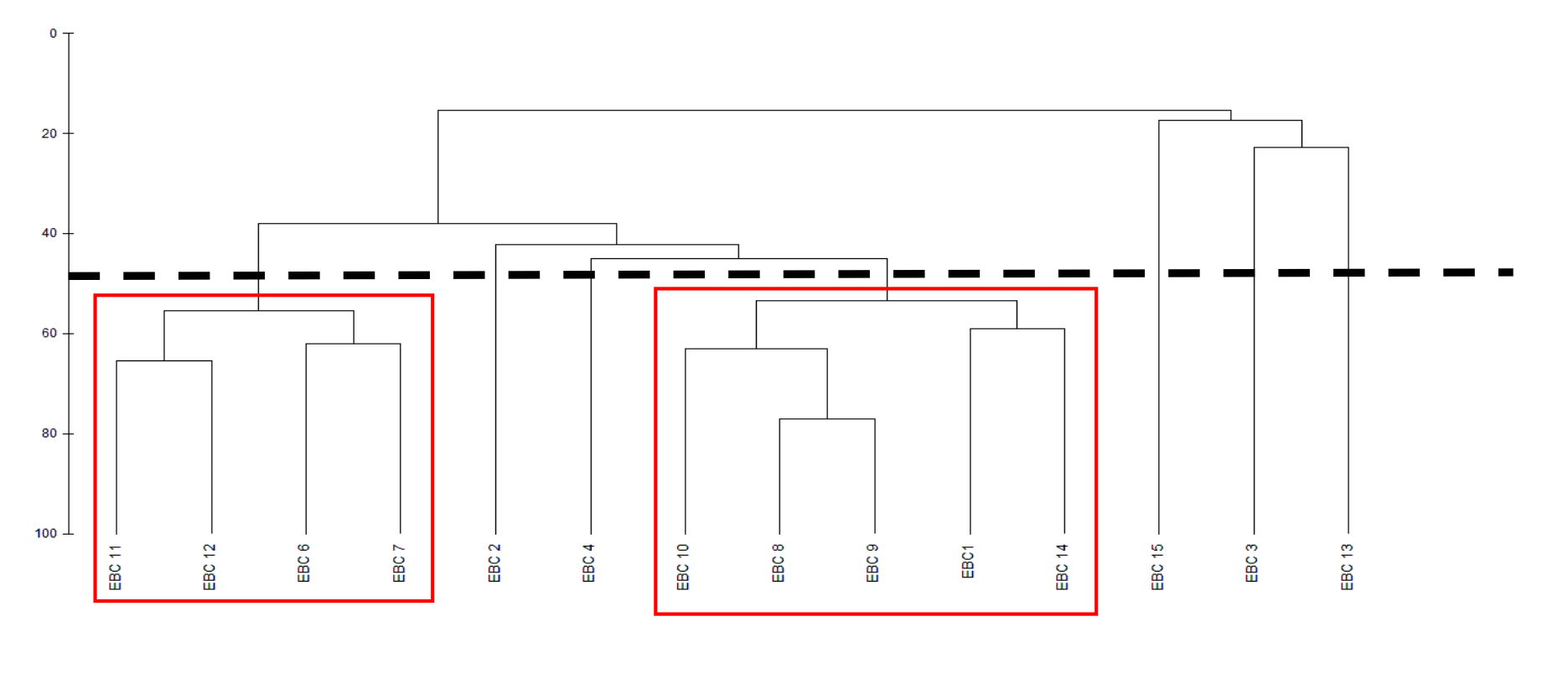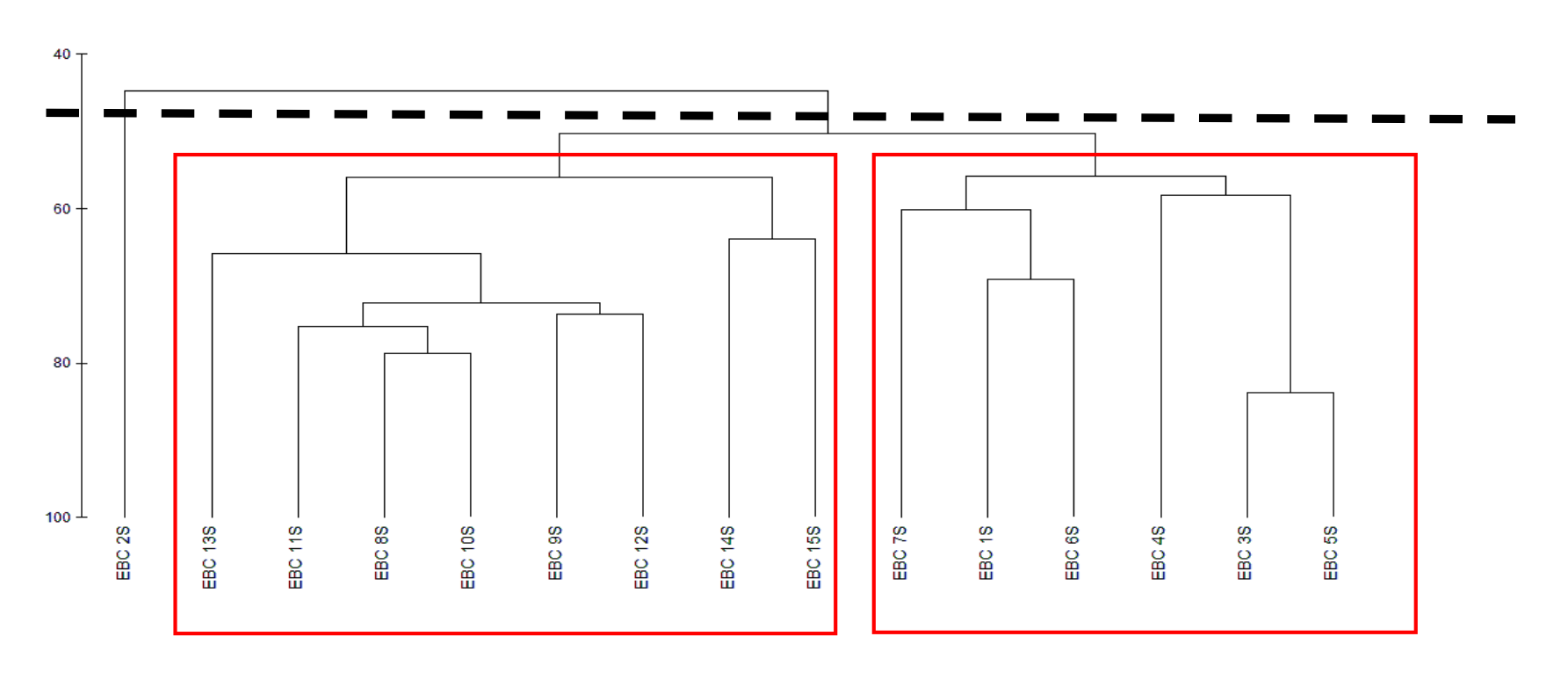 Del índice de similaridad de Bray-Curtis aplicado para obtener la distribución de la comunidad de fitoplancton a lo largo de la bahía de Cartagena, en las dos épocas climáticas; se obtuvieron dos dendogramas (Figura 6 y Figura 7). En los dendogramas se observa que en la época seca la distribución de los taxa estuvo determinada por la presencia de diatomeas pennadas principalmente en la zona noroccidental y parte de la nororiental; y por el grupo de los dinoflagelados en la zona suroccidental y suroriental.
