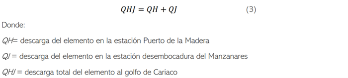 El golfo de Cariaco recibe la descarga de sólidos y metales pesados provenientes de las aguas que pasan por la estación Puerto de la Madera (estación H, en la Figura 1) que corresponde a un aliviadero construido en el año 1970 para evitar las inundaciones, y las que llegan a desembocadura del río Manzanares (estación 10). Para estimar la magnitud de estas descargas, se sumaron las cargas másicas de los sólidos durante los dos muestreos, lo mismo se hizo con los metales pesados en esas dos estaciones. La descarga se calculó utilizando la Ec.3.