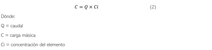 La carga másica (ton·día-1) de sólidos y metales pesados de toda la cuenca se estimó multiplicando la concentración de cada elemento de interés, por el caudal medido en ese mismo sitio. Esto se realizó para cada uno de los dos meses muestreados, y fueron calculadas utilizando Ec. 2.
