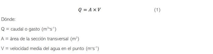 El caudal se determinó mediante un flujómetro, siguiendo los principios del método descrito en Chow (1994). Se utilizó un flujómetro TSK de 7,5 de longitud y 8,5 cm de diámetro de flujo mínimo de 8 cm·s-1 y máximo de 3 m·s-1, en vez de un molinete, pero el principio es el mismo. El rango de calibración fue de 0,25 - 2,33 m·s-1. Se tomaron medidas del ancho del río y se realizaron tres mediciones, dos en cada extremo y uno en el centro del río; la profundidad de cada sitio también fue medida. Los caudales finales fueron reportados en m·s-1 y se calcularon utilizando Ec.1