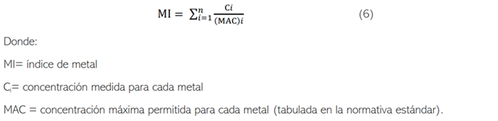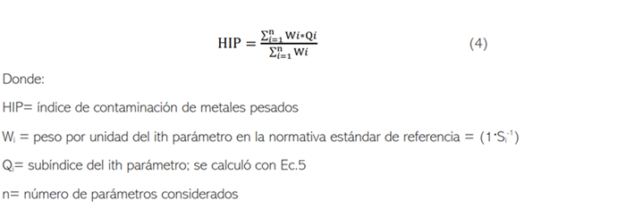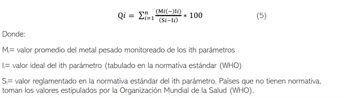 Se calcularon a través de los índices de contaminación de metales pesados HIP y MI (Heavy Metal Pollution Index y Metal index), desarrollados por Mohan et al. (1996) y Tamas y Cini (2004) respectivamente. Se realizó una modificación en el HIP y MI, incorporando los valores sugeridos para aguas de Tipo IA y AB de la normativa venezolana (Decreto 883 de la Gaceta Oficial República de Venezuela), puesto que estos índices utilizan los valores estandarizados para cada país. Se realizó una evaluación de la cuenca total, por estaciones y por muestreos. La importancia de utilizar estos índices es que toma en consideración los efectos cinegéticos y antagónicos de un metal sobre otro, caso que no es considerado en el Decreto 883 de la legislación venezolana. El juicio para interpretar estos índices es que si el HPI>100, indica que existe contaminación. Igualmente, si MI>1 existe contaminación. Los cálculos de los índices (HIP) se realizaron a partir de Ec. 4 y Ec. 5 y MI a través de Ec. 6. Los criterios empleados para clasificar la calidad del agua usando el MI se fundamentaron en lo propuesto en Lyulco et al. (2001) y Caerío et al. (2005), tal como se especifica en la Tabla 1.