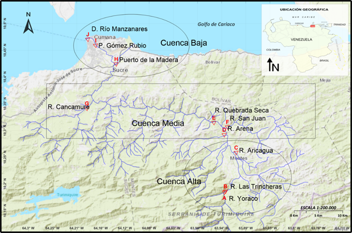 La cuenca del río Manzanares fue dividida en tres secciones o subcuencas, cuenca Alta (río Yoraco y río Aricagua), Media (entre río Arenas y río Cancamure) y Baja (Puerto la Madera sector Aliviadero hasta la desembocadura del Manzanares en el golfo de Cariaco). Esta división se realizó por diferencias del gradiente altitudinal de acuerdo con lo señalado en Márquez et al. (2019). Se realizaron dos muestreos aleatorios de diez estaciones cada uno, el 26 de septiembre del año 2017 (lluvia) y el 3 de abril del 2018 (sequía), en el canal principal del Manzanares y varios de sus tributarios, los cuales fueron geo-referenciadas con un GPS marca Garmin 12xl. Las estaciones fueron (río Yoraco (A), Las Trincheras (B), río Aricagua (C), río Arenas (D), Quebrada Seca (E), río San Juan (F), río Cancamure (G), Puerto de la Madera (H), Puente Gómez Rubio (I) y desembocadura del río Manzanares (Figura 1).
