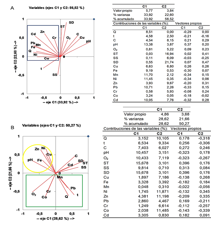 Las proyecciones ortogonales mostraron que, para el mes de septiembre del 2017, los dos primeros componentes explican el 56,52 % de la varianza total de los datos (Figura 2A) y para abril del 2018 el 50,27 %, siendo en ambos casos el componente C1 es mayor peso para explicar las variaciones observadas en la distribución de los diferentes parámetros fisicoquímicos y metales pesados. La distribución en los valores de C1 y C2 refleja la complejidad en la química del agua, así como de la geología de la cuenta, que incluye su relieve, tipo de suelos y vegetación. Para septiembre del 2017, mes que corresponde a la temporada de lluvia, en el cuadrante de valores negativos del componente C1 y en el positivo del componente C2 se aprecia una asociación de los metales Fe, Mn, Zn, Cr, Co, Pb y Cd con el caudal, indicando dependencia de las concentraciones de los metales con el caudal, al mismo tiempo fuente de origen similar para los metales. El cobre al igual que los parámetros fisicoquímicos pH, conductividad, oxígeno disuelto se asocian de manera opuesta al caudal lo cual es indicativo que estos valores descienden con el aumento del caudal. El cobre también está asociado con los sólidos totales y disueltos. Para abril del 2018 que corresponde a sequía (Figura 2B), la situación es un poco diferente, se aprecia tanto el C1 una independencia de los metales con el caudal, solo Mn y Pb se asocian positivamente con el caudal en el componente C1; y Cr y Co lo hacen de manera opuesta. Igualmente, Cd se asocia a las concentraciones de sólidos. Por otra parte, en el componente C2, los metales Fe, Zn, Cu y Ni se asocian con el pH y opuestamente a O2, lo cual indica que estos metales pueden tener orígenes similares. Estos metales que también se asocian de manera contraria a los sólidos totales y disueltos en el componente C1. Se puede inferir que durante época de lluvia los metales en su mayoría excepto Cu dependen del caudal y en sequía son independientes de este parámetro, excepto Pb y Mn.
