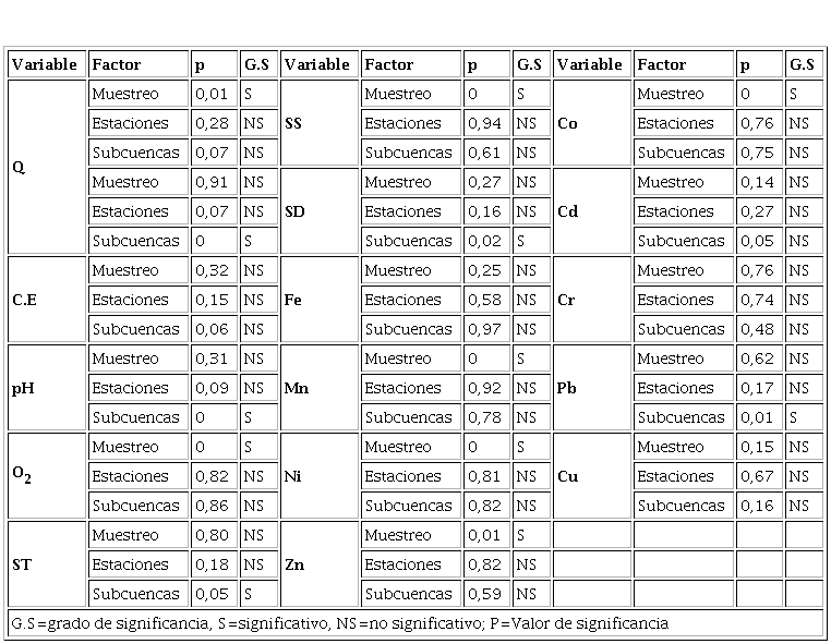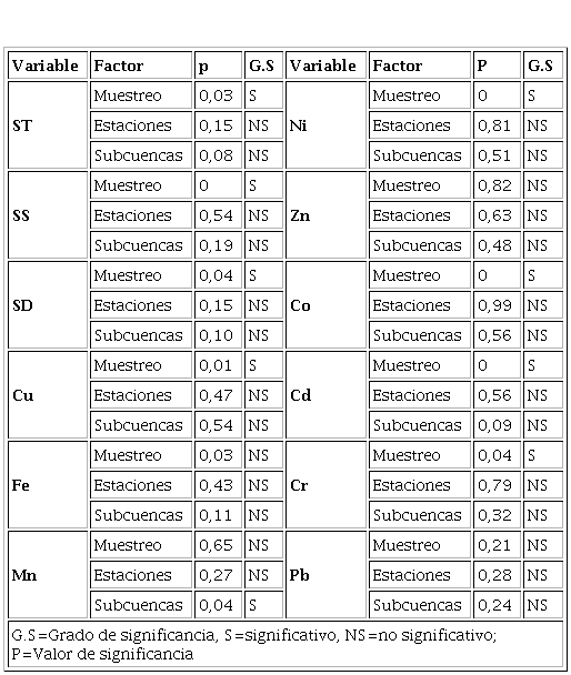 Las variables fisicoquímicos de las aguas de la cuenca del río Manzanares no mostrarón variaciones estadisticas significativas a nivel de las diferentes estaciones. A nivel de sub-cuencas solo la temperatura, el pH, los sólidos totales y disueltos y el plomo mostraron variaciones. Cuando consideramos los muestreos que incluyeron meses de sequía y lluvia, se observaron variaciones, sólo para el caudal, concentración de oxígeno disuelto, solidos suspendidos y los metales Ni, Zn y Co (Tabla 8 y Tabla 9).