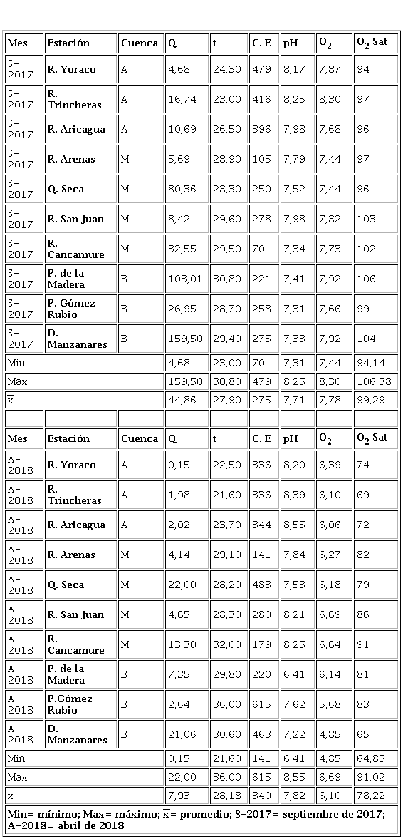 La temperatura (t) en el muestreo de septiembre de 2017 presentó un promedio de 27,9 °C en toda la cuenca. El valor mínimo de temperatura se detectó en la estación Las Trincheras, en la cuenca alta, con 23 °C y el máximo de 30,8 °C, en la estación Puerto de la Madera, cuenca baja. Para el muestreo de abril del 2018 fue de 28 ºC, con un mínimo de 21,6 ºC en la estación Las Trincheras, cuenca alta; y un máximo de 36 ºC en Puente Gómez Rubio, cuenca baja (Tabla 2). Para septiembre del 2017 se apreció un promedio en la conductividad de 274,8 mS·cm-3; el mínimo en la estación río Cancamure, cuenca media, con un valor de 70 mS·cm-3; y el máximo en la estación río Yoraco, cuenca alta, con 479 mS·cm-3. En abril del 2018 fue de 339,7 mS·cm-3; el mínimo se observó en la estación río Arenas, con un valor de 141 mS·cm-3; y el máximo de 615 mS·cm-3 en Puente Gómez Rubio (Tabla 2).