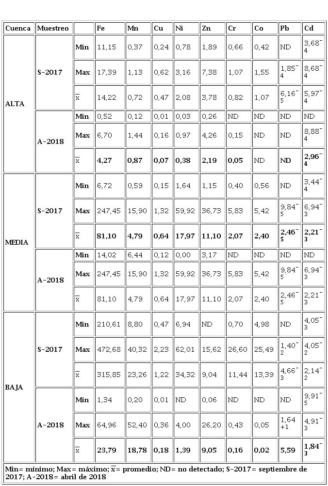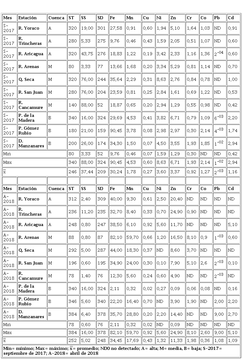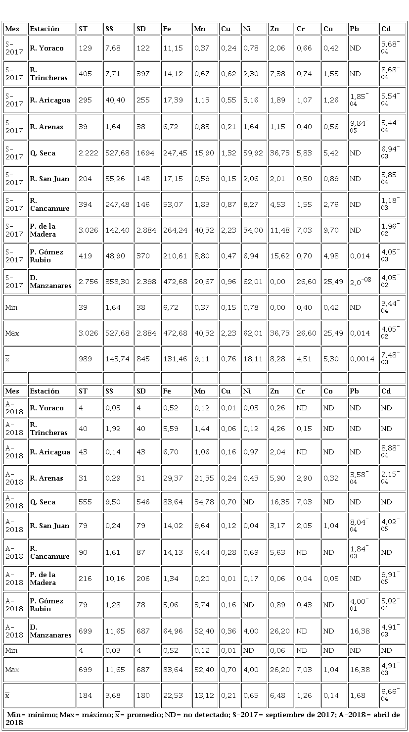 El promedio del hierro fue de 30,24 mg·L-1 en septiembre en 2017, con un mínimo de 9,76 mg·L-1 en la estación Las Trincheras; y máximo de 90,45 mg·L-1 en Puente Gómez Rubio de la cuenca baja. Durante abril del 2018 fue de 34,45 mg·L-1. El mínimo 2,11 mg·L-1 se apreció en la estación Puerto de la Madera de la cuenca baja y el máximo de 82,10 mg·L-1, en río Arenas en la cuenca media. El promedio de manganeso en septiembre 2017 fue de 1,78 mg·L-1, el mínimo de 0,46 mg·L-1 se determinó en Las Trincheras, cuenca alta y el máximo de 4,53 mg·L-1 en Puerto de la Madera, cuenca baja. En abril del 2018 fue de 17,69 mg·L-1. El mínimo de 0,32 mg·L-1 se detectó en Puerto de la Madera, cuenca baja, y el máximo de 59,79 mg·L-1 en río Arenas cuenca media. El promedio de cobre fue de 0,27 mg·L-1 en septiembre, con mínimo de 0,07 mg·L-1 en la estación desembocadura del Manzanares y un máximo de 0,60 mg·L-1, en la estación río Yoraco en cuenca alta. En abril del 2018 fue de 0,43 mg·L-1; el mínimo 0,02 mg·L-1 se determinó en Puerto de la Madera, cuenca baja y el máximo (0,92 mg·L-1) en el río Aricagua, cuenca alta. El promedio del níquel en septiembre 2017 fue de 3,60 mg·L-1. El mínimo de 1,59 mg·L-1 se observó en Las Trincheras, cuenca alta y el máximo de 8,63 mg·L-1 en Quebrada Seca, cuenca media. En abril 2018 fue de 1,32 mg·L-1, y el mínimo (no detectado) se ubicó en Quebrada Seca, cuenca media; el máximo de 5,60 mg·L-1 se detectó en la estación río Aricagua, cuenca alta (Tabla 3).
