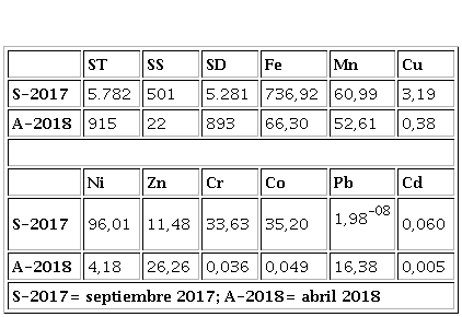 Las concentraciones promedio de metales pesados (mg·L-1) presentaron un orden decreciente, de Fe (30,24) >Ni (3,60) >Zn (3,37) >Mn (1,78) >Co (1,27) >Cd (1,16) >Cr (0,92) >Cu (0,27) >Pb (0,0022) para septiembre del 2017 y Fe (34,45) >Mn (17,69)>Zn (11,33)> Cr (1,98)>Ni (1,32) >Cd (1,09) >Pb (1,08) >Cu (0,43) >Co (0,36) para abril del 2018 (Tabla 3).