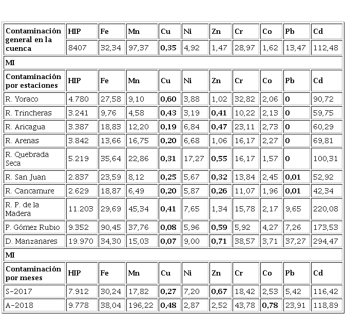 Cuando se analizan los índices por estaciones de muestreo se observó el mismo impacto por metales ya que los valores de HIP son mayores a 100. El Cobre no contribuye a la contaminación puesto que los valores de MI<1. Igualmente, Zn no contribuye en las estaciones las Trincheras, río Aricagua, Quebrada Seca, río San Juan, Río Cancamure, Puente Gómez Rubio y la desembocadura del Manzanares, ya que MI<1. El Plomo igualmente contribuye a la contaminación solo en Puerto la Madera, Gómez Rubio y la desembocadura del Manzanares. Durante los meses de muestreo, se observó contaminación influida por la mayoría de los metales, excepto para cobre y zinc durante el mes de septiembre del 2017 y para cobalto durante abril del 2018, ya que los valores de MI<1.