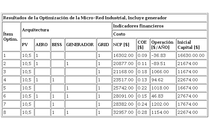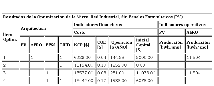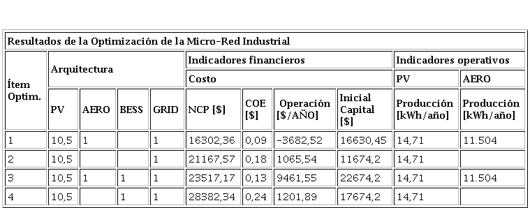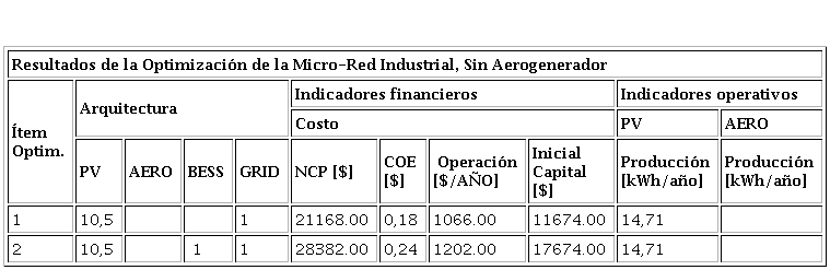 Tabla 2. Soluciones optimas de la Micro-Red del caso de estudio Industrial, realizada en HOMER Pro.