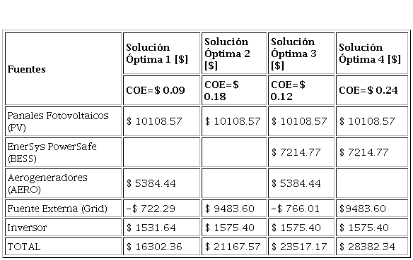 Tabla 3. Costos de las fuentes de las soluciones Optimas determinadas para la Micro-Red Industrial.