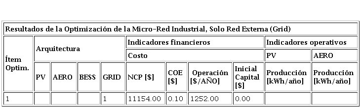 En virtud que la industria realiza su producción en el horario de 07:00 a 18:00. La Micro- Red se conformó por; red externa (Grid), paneles solares (PV), Inversor de energía, baterías y aerogeneradores, y para el análisis de la micro-red se utilizó una tasa de discontinua del Banco Central de 13%, la tasa de inflación de 2.5% y a 25 años de vida útil del proyecto. El costo de la red externa (Grid), se estableció un costo de 0.100 ($/kWh).
