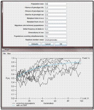 Los estudiantes comenzarán explorando el incumplimiento del supuesto de Hardy-Weinberg que establece que la población debe ser muy grande, y las consecuencias que esto genera sobre la estabilidad y permanencia de las frecuencias génicas en las poblaciones. En poblaciones pequeñas, las frecuencias alélicas están sujetas a fluctuaciones aleatorias derivadas del muestreo de gametos. Este cambio azaroso, denominado proceso dispersivo, se diferencia de los procesos sistemáticos (selección, mutación y migración) en que solo puede predecirse su magnitud, pero no su dirección (Fontdevila y Moya, 2000).