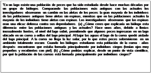 Como actividad ampliatoria, se retomará el ejemplo propuesto por Galli y Meinardi (2015) para trabajar el tema de la evolución por selección natural (Parte b del ejercicio de los Peces, página 106; ver Anexo 4). El análisis permitirá observar que, al igual que en el caso del guepardo, la mayor frecuencia de peces ciegos en ambientes cavernícolas puede explicarse no solo por selección natural, sino también por un efecto cuello de botella, destacando la interacción de ambas fuerzas evolutivas en la explicación del fenómeno.