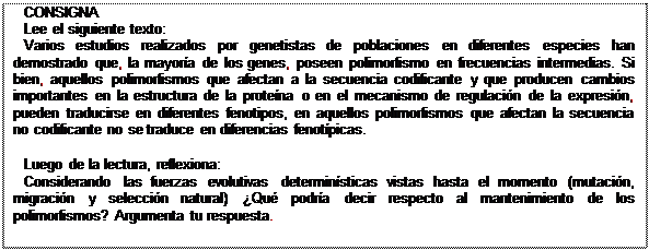 La primera actividad se plantea luego de haber abordado en la clase teórica el concepto de polimorfismo, pero antes de introducir el tema de deriva génica. Esta consiste en el análisis y la puesta en común de reflexiones entre los estudiantes, a partir de la lectura de un breve texto, que describe la presencia de polimorfismos en niveles intermedios en la mayoría de las poblaciones.