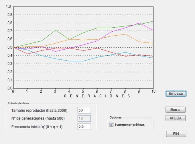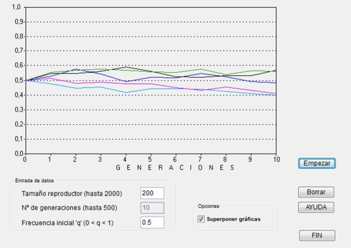 Los estudiantes trabajarán en grupos, “confeccionando” una población artificial de 50 individuos y frecuencias alélicas iniciales de 0,5 para p y q. A continuación, se les pedirá que diseñen y modelicen la evolución de las frecuencias durante 10 generaciones, simulando en cada una un cuello de botella, reduciendo la población al 20 % de su tamaño original.