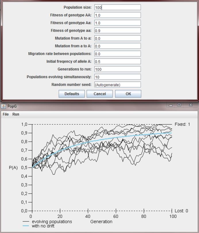 La segunda actividad de este momento consiste en retomar las simulaciones planteadas en el primer momento, incorporando el conocimiento trabajado sobre deriva génica. Utilizando el software PopG (Felsenstein, 2016), los estudiantes repetirán las simulaciones anteriores, pero incluyendo el tamaño poblacional como parámetro variable, además de las tasas de mutación, migración y aptitudes genotípicas (Véase Anexo 2 para ejemplos de salida).