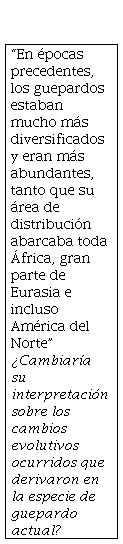 “Un ejemplo típico de cuello de botella natural es el que sufrió el guepardo (Acinonyx jubatus) durante las glaciaciones del Pleistoceno. En épocas precedentes, los guepardos estaban mucho más diversificados y eran más abundantes, tanto que su área de distribución abarcaba toda África, gran parte de Eurasia e incluso América del Norte. De entre las distintas especies de guepardos que existieron en el Plio-Pleistoceno, la que dio lugar al guepardo actual fue Acinonyx pardinensis, un animal de gran tamaño, más robusto pero menos veloz que el actual, disperso por África, sur de Europa y Oriente Medio. Con la llegada de los hielos, gran parte del hemisferio norte se congeló o pasó a un clima frío (taiga, tundra, estepa), mientras que en las regiones tropicales, la falta de agua retenida en los glaciares polares provocó un clima más seco. Como consecuencia, la mayor parte de los guepardos se extinguieron y solo quedaron unos pocos miles de A. pardinensis (o quizá, solo unos cientos) en Oriente Próximo y parte de África, mucho más delgados, estilizados y veloces que la forma característica de la especie original. Habían perdido rápidamente muchos caracteres hasta entonces comunes, que fueron sustituidos por otros raros (delgadez, tamaño pequeño, mayor velocidad) que hasta entonces eran eliminados o simplemente pasados por alto por la selección natural, y que ahora eran precisamente los más adecuados para sobrevivir. En la actualidad, la nueva especie resultante, Acinonyx jubatus, es uno de los mamíferos con menor diversidad génica. Por si fuera poco, el guepardo ha sido cazado y expulsado de diversas zonas debido al avance de la agricultura, disminuyendo aún más su población.”