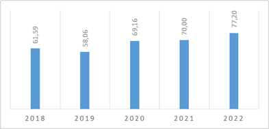 En el análisis de los datos, si se considera únicamente a los estudiantes que cursaron efectivamente la asignatura se refuerza esta tendencia: 61,59% en 2018, 58,06% en 2019, 69,16% en 2020, 70,00% en 2021 y 77,20% en 2022 (Gráfico 2). Concretamente, se aprecia que entre el año 2018 al 2019 hubo una disminución porcentual en la regularidad del 3,53%, pero cuando empezó a implementarse el proyecto, desde el año 2019 al 2020 la condición de regularidad aumentó un 11,10%, y desde el año 2019 al 2021 el incremento porcentual fue de 11,94% aún en período de pandemia. Asimismo, al comparar el porcentaje de estudiantes regulares del año 2019 (antes de la implementación del proyecto) con el año 2022 (año post pandemia) el incremento es del 19,14%. Estos datos sugieren que la implementación del proyecto innovador contribuyó a mejorar los resultados académicos de los estudiantes, alcanzando el mayor porcentaje de regularidad en el año 2022.