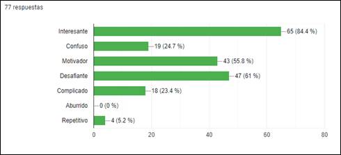 A modo de valoraciones, la palabra Interesante fuelamás seleccionada por los estudiantes, seguido de los calificativos Desafiante y Motivador y, en menor medida, Confusa, Complicada y Repetitiva. Ningún estudiante atribuyó a la actividad la palabra Aburrida y algunos estudiantes combinaron las palabras Complicada, Desafiante e Interesante. El Gráfico 1 muestra la frecuencia con que fue indicado cada adjetivo y el porcentaje que representa. Se puede observar que la palabra Interesante fue elegida por 65 estudiantes (84,4%), la palabra Desafiante fue mencionada47 veces (61,0%), Motivadora, 43 veces (55,8%) y las palabras Confusa y Complicada fueron señaladas por 19 y 18 estudiantes respectivamente (24,7% y 23,4%); además 4 estudiantes eligieron la palabra Repetitiva (5,2%).