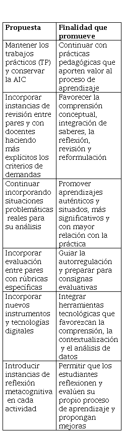 Los hallazgos de este estudio, junto con los aportes teóricos sobre evaluación formativa y continua, permitieron delinear una propuesta de mejora del sistema de evaluación, orientada a profundizar su carácter procesual, reflexivo y contextualizado. Entre los principales ejes se destacan: la continuidad de los trabajos prácticos y la actividad integradora de campo, la incorporación de criterios explícitos y rúbricas, la diversificación de formatos e instancias de retroalimentación, la integración de actividades colaborativas y el fortalecimiento de las habilidades metacognitivas de los estudiantes. Se propone, además, el uso estratégico de tecnologías para motivar el aprendizaje, facilitar el seguimiento y ampliar las oportunidades de reflexión.