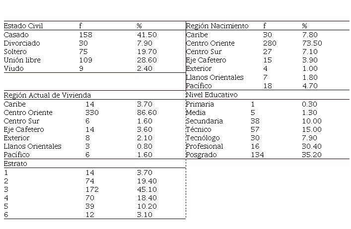 En primer lugar, cabe anotar que no se encontraron diferencias significativas relacionadas con la región de nacimiento, la región de vivienda, el nivel educativo, el lugar de trabajo, el estrato para el pago de servicios públicos y la cantidad de personas con quienes conviven. Para los demás datos sociodemográficos el análisis se muestra a continuación.