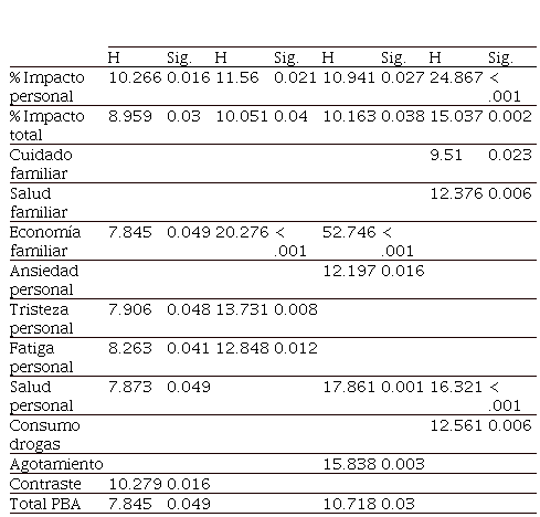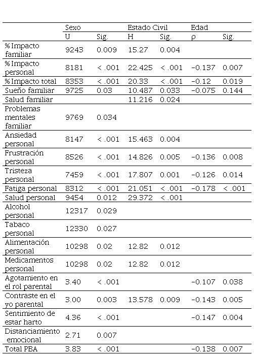En la tabla se muestran los resultados significativos de las comparaciones de mediana entre los sexos con la U de Mann Whitney, el análisis de varianza con la H de Kruskal Wallis y las correlaciones con el Rho de Spearman para las medidas de percepción del impacto durante la pandemia por COVID-19 y el agotamiento parental.