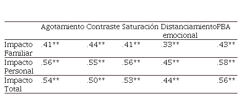 La Tabla 4 ilustra relaciones estadísticamente significativas entre los factores de agotamiento parental con los índices de afectación personal, familiar y total percibidos. En la medida en que incrementó la percepción de afectación familiar, personal y total, hubo un incremento claramente significativo en las medidas globales y específicas del agotamiento parental. Esto indica que a mayor afectación percibida durante la pandemia por COVID-19, son más frecuentes los sentimientos de agotamiento en las actividades de crianza y cuidado de los hijos, de culpabilidad por no satisfacer el rol parental idóneo para la cultura, de estar harto con su papel como madre y padre, y de distancia afectiva hacia los hijos.