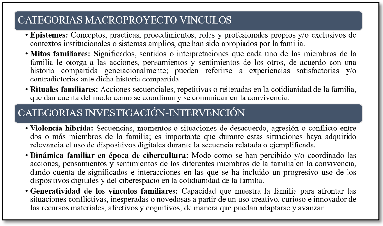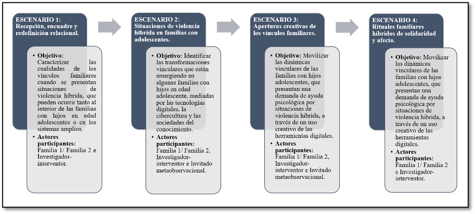 Por ende, partiendo de esta problematización, se planteó el siguiente objetivo investigativo: comprender la complejidad de los vínculos y sus cualidades generativas, cuando se presentan situaciones de violencia híbrida, en algunas familias con hijos adolescente enmarcadas en la cibercultura, para favorecer la emergencia de dinámicas vinculares con posibilidades creativas.