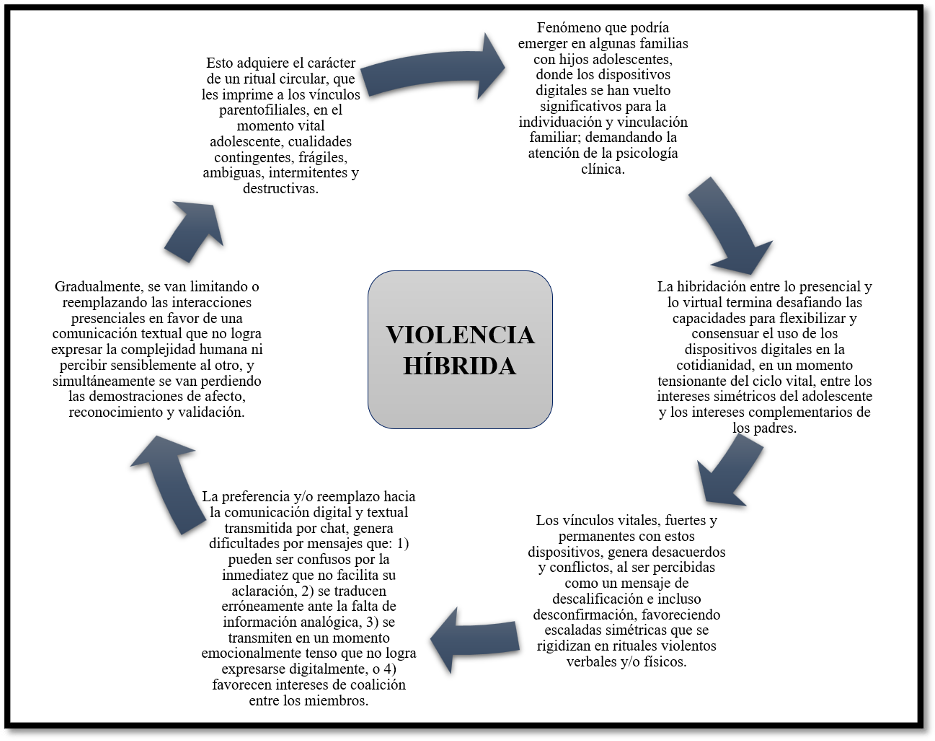 La violencia híbrida emerge como un fenómeno clínico en la transición vital de las familias con adolescentes, donde los artefactos digitales agregan incertidumbres a un ritmo desestabilizador, generando la pérdida de demostraciones afectivas y aumentando la descalificación o desconfirmación, hasta convertir los vínculos parentofiliales como contingentes, frágiles, ambiguos, intermitentes y destructivos, demandando la intervención de la psicología clínica.