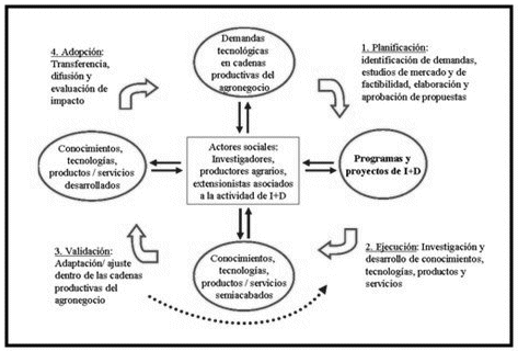 El modelo de gestión de la ciencia del INISAV se caracteriza básicamente por su vínculo con las demandas del entorno agrario. La Gestión de la ID+i (Figura 1) se amplía a cuatro etapas: la Planificación, la Ejecución - generación de tecnologías (procesos y productos), la Validación de las tecnologías y la adopción - perfeccionamiento de tecnologías (Muiño-García et al. 2007). El proceso de adopción en todos los casos, incluye la formación de especialistas de los Laboratorios Provinciales y las Estaciones Territoriales, técnicos que producen y asesoran a los agricultores, especialistas de sanidad vegetal en todas las instancias, así como directamente a los productores agrícolas, a través de un sistema permanente de capacitación y actualización.