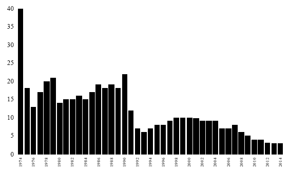 Aportes a la protección del medio ambiente y a la inocuidad de los productos agrícolas. Los impactos del manejo de plagas como nuevo enfoque en la fitosanidad, constituyen sistemas que se integran a la tecnología del cultivo, que se aprecian en varios componentes importantes, especialmente la reducción del uso de los plaguicidas químicos en más de 40 veces, desde el año 1974 hasta el 2014 (Figuras 4 y 6).