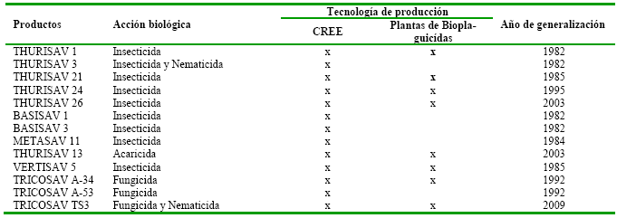 El programa de control biológico concierne como salidas, las tecnologías de producción de microrganismos benéficos y productos, las cuales fueron generadas a través de proyectos y transferidas a la red de laboratorios y plantas destinados para este fin (Tabla 1).