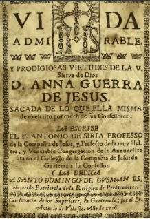 La vida admirable de Anna Guerra de Jesús reconstruye la vida ejemplar de una humilde mujer fruto de sus confesiones con el fin de construir un alegato a favor de su beatificación. El texto es suscrito por uno de sus confesores jesuitas, Antonio de Siria.
