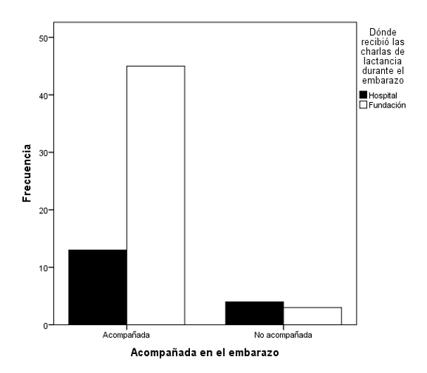 La Figura 5 muestra la asociación entre el lugar donde las madres recibieron las charlas de lactancia y el reporte de acompañamiento percibido. La duración de la lactancia (en meses) fue similar entre quienes recibieron charlas en el hospital y en la fundación, sin embargo, las madres que recibieron charlas en la fundación reportaron sentirse más acompañadas durante el embarazo, χ²(1) = 3.901, p < .048.