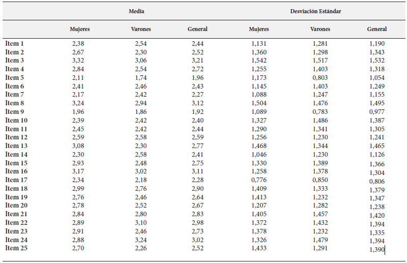 Según la tabla 1 se aprecia que las medias de los ítems se encuentran entre 1,96 y 3,32 en el caso de mujeres y para el caso de varones las medias oscilan entre 1,74 y 3,24. Siendo los ítems de menor puntuación el 9 en caso de las mujeres y el ítem 5 en caso de los varones. Los ítems con mayor puntaje es el item3 para las mujeres y el ítem 24 para los varones.